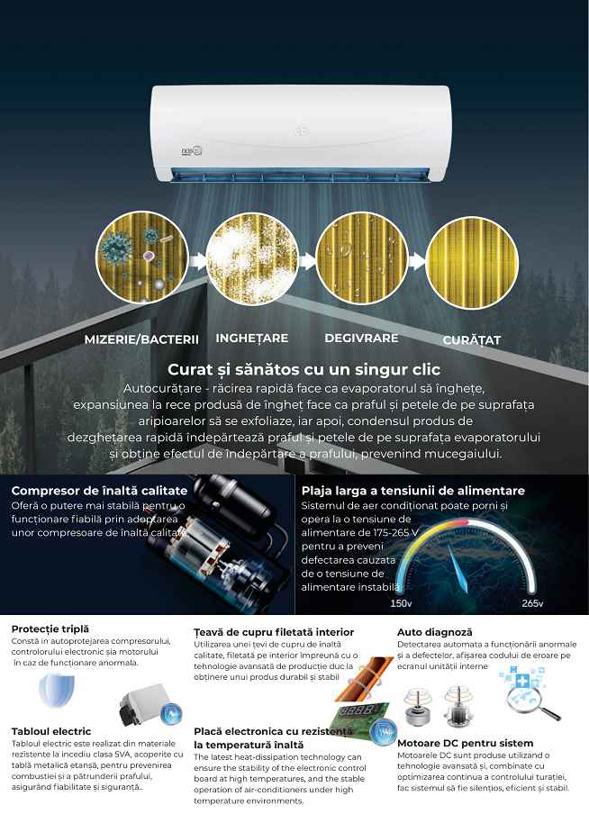 Functie de autocuratare – previne dezvoltarea mucegaiului si a bacteriilor in unitatea interioara.